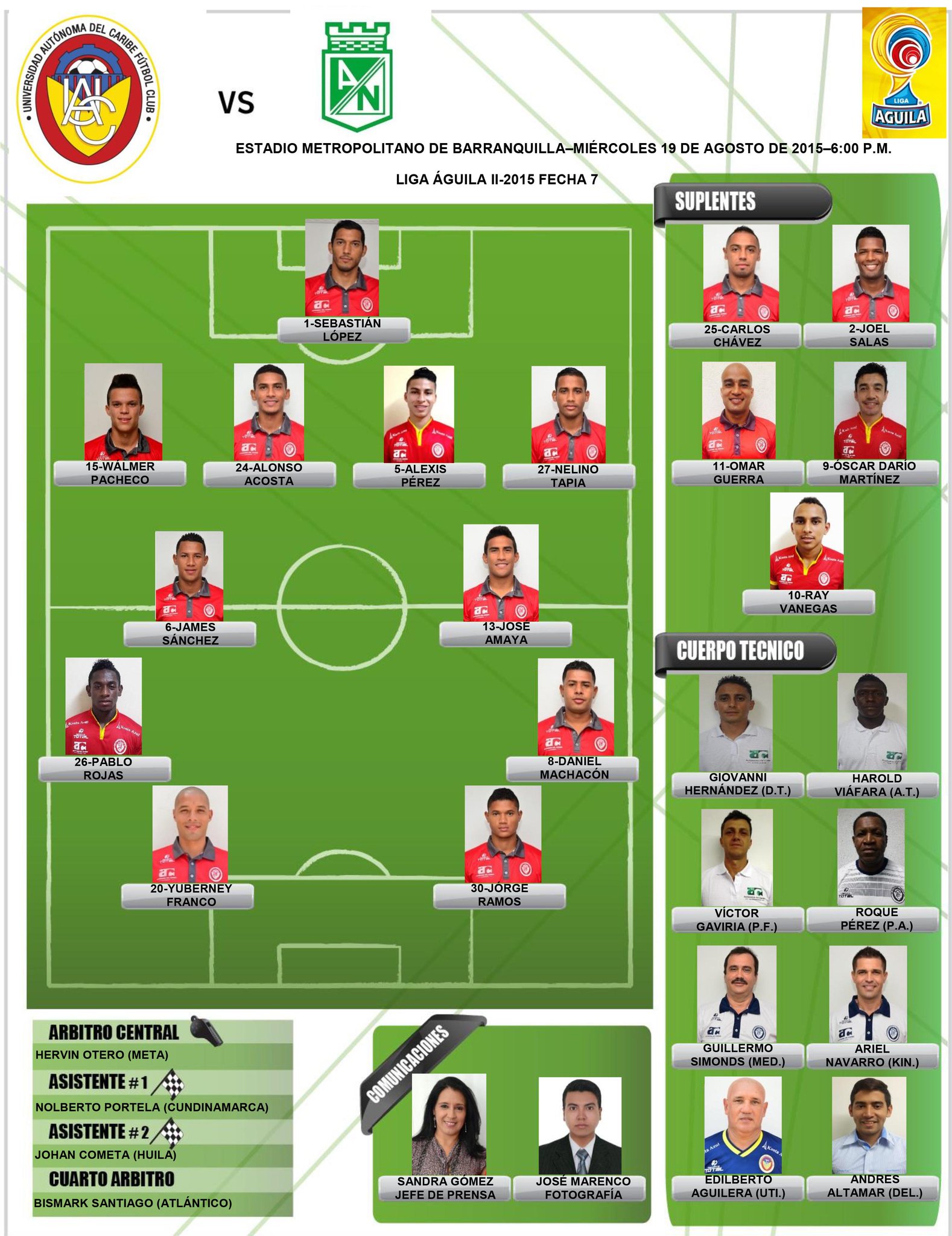 Uniautónoma (1): Sebastián López; Wálmer Pacheco, Alonso Acosta, Alexis Pérez y Nelino Tapia; James Sánchez y 'Ringo' Amaya; Pablo Rojas, Daniel Machacón (Joel Salas, 73') y Jorge Ramos (Ray Vanegas, 73'); Yuberney Franco (Óscar Martínez, 88').